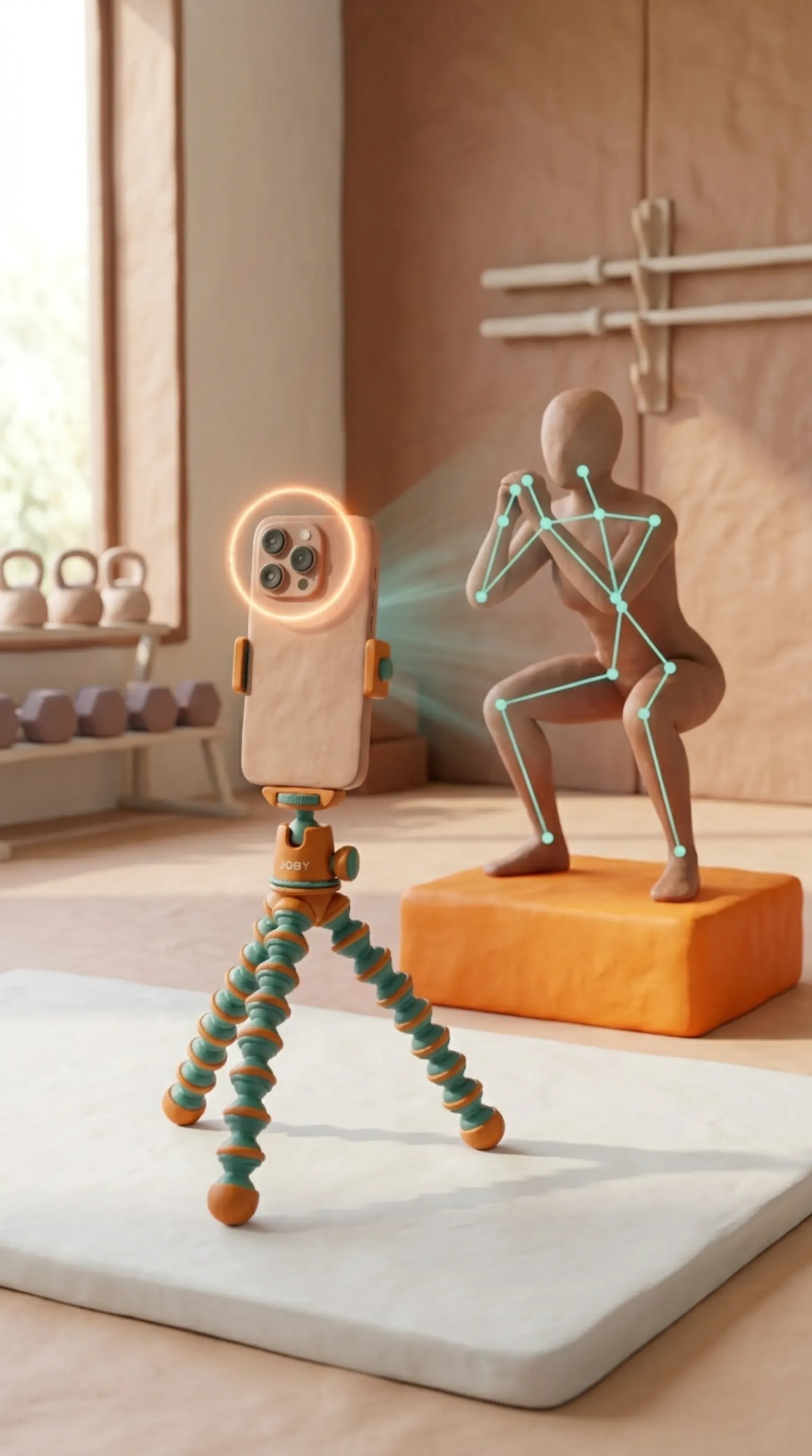 Kamera auf's Stativ. Die App erkennt deine Haltung in Echtzeit und gibt ehrliche Tipps — wie ein Trainer.
